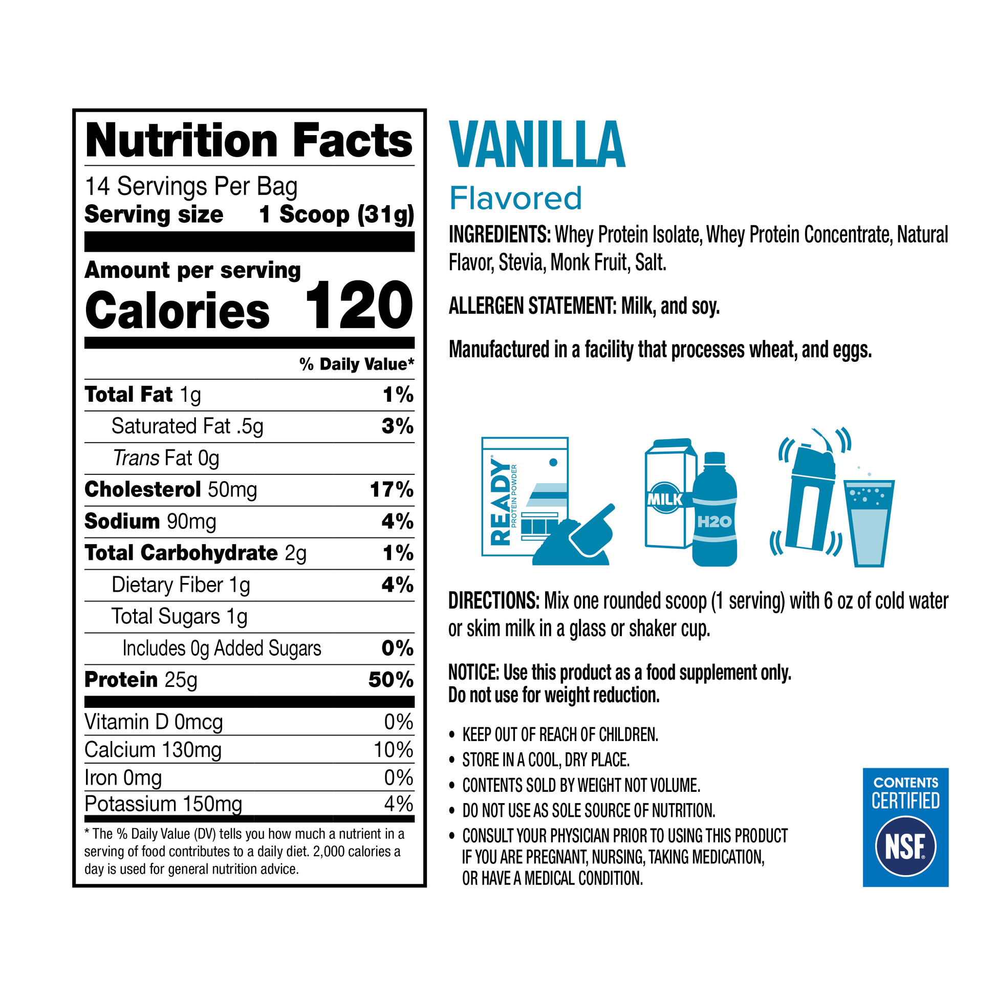 Whey Protein Isolate, Whey Protein Concentrate, Natural Flavor, Stevia, Monk Fruit, Salt.