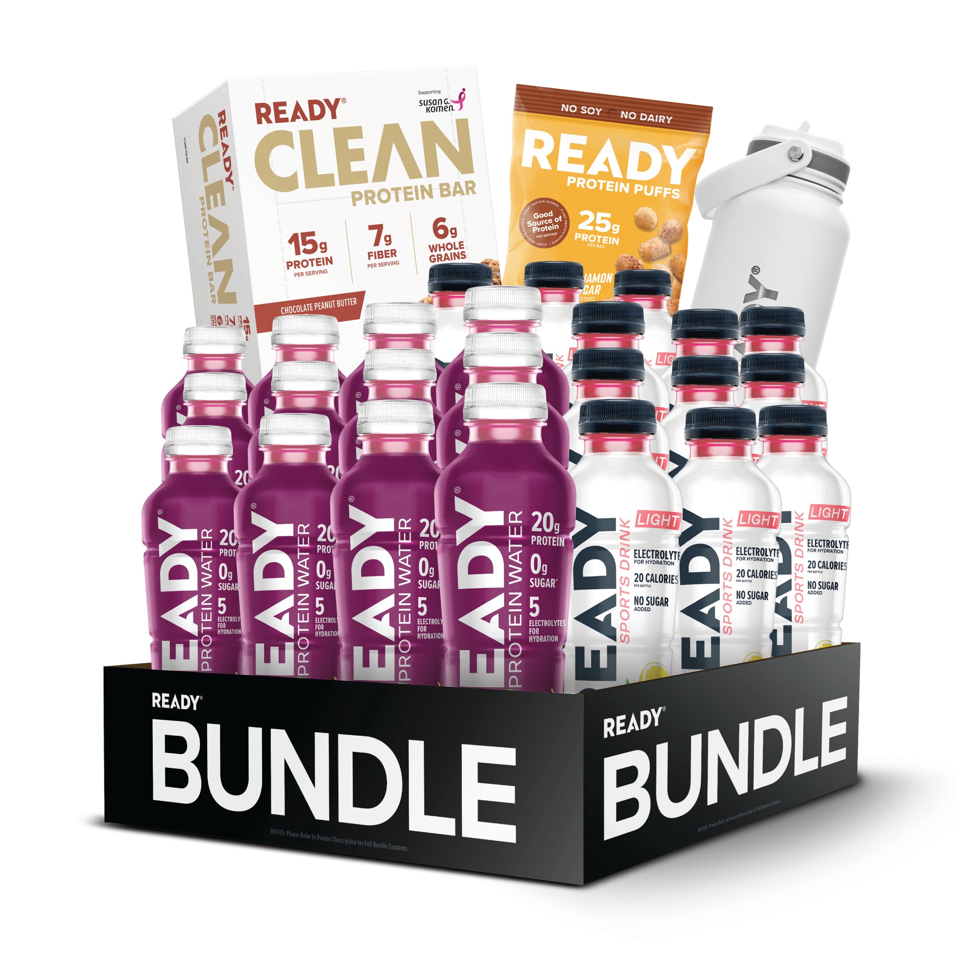 The Ready® Variety Bundle is the perfect way to try our top flavors and products. Protein packed water and snacks will have you coming back from more.