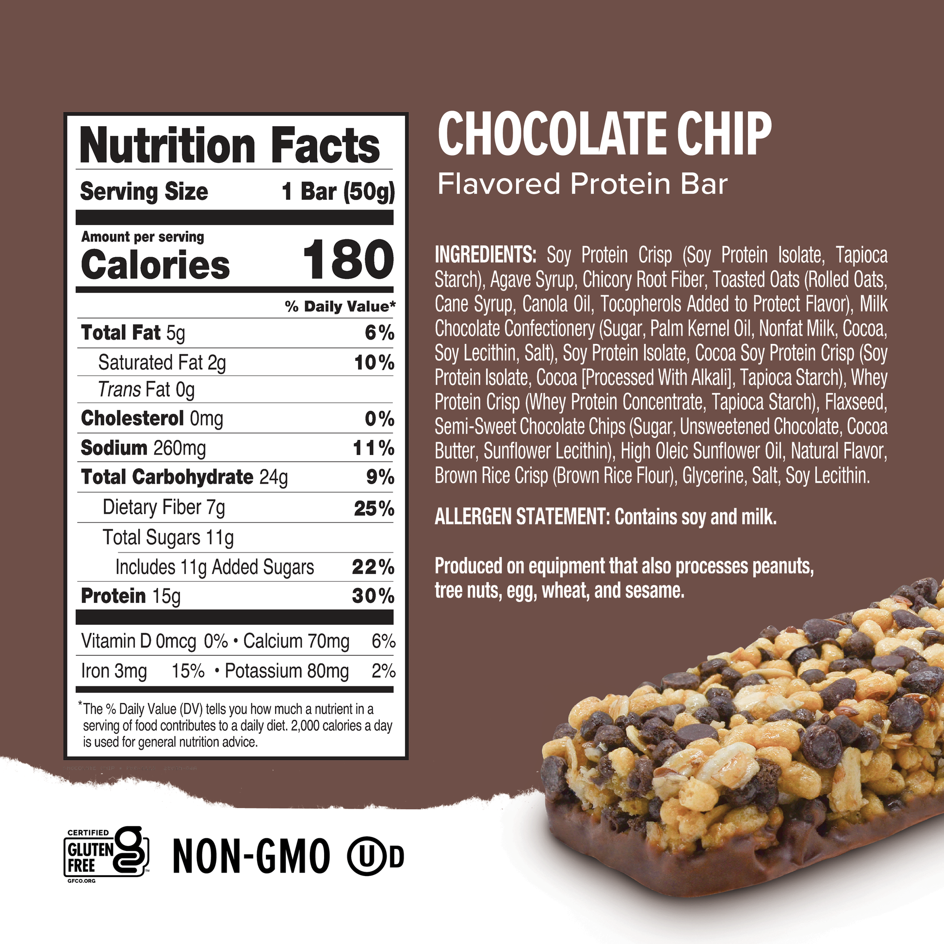 Soy Protein Crisp (Soy Protein Isolate, Tapioca Starch), Agave Syrup, Chicory Root Fiber, Toasted Oats (Rolled Oats, Cane Syrup, Canola Oil, Salt, Tocopherols Added to Protect Flavor), Milk Chocolate Confectionery Coating (Sugar, Palm Kernel Oil, Nonfat Milk, Cocoa, Soy Lecithin, Salt), Soy Protein Isolate, Cocoa, Soy Protein Crisp (Soy Protein Isolate, Cocoa Processed with Alkali, Tapioca Starch), Whey Protein Crisp (Whey Protein Concentrate, Tapioca Starch), Flaxseed, Semi-Sweet Chocolate Chips (Sugar, Unsweetened Chocolate, Cocoa Butter, Sunflower Lecithin), High Oleic Sunflower Oil, Natural Flavor, Brown Rice Crisp (Brown Rice Flour), Glycerin, Salt, Soy Lecithin.