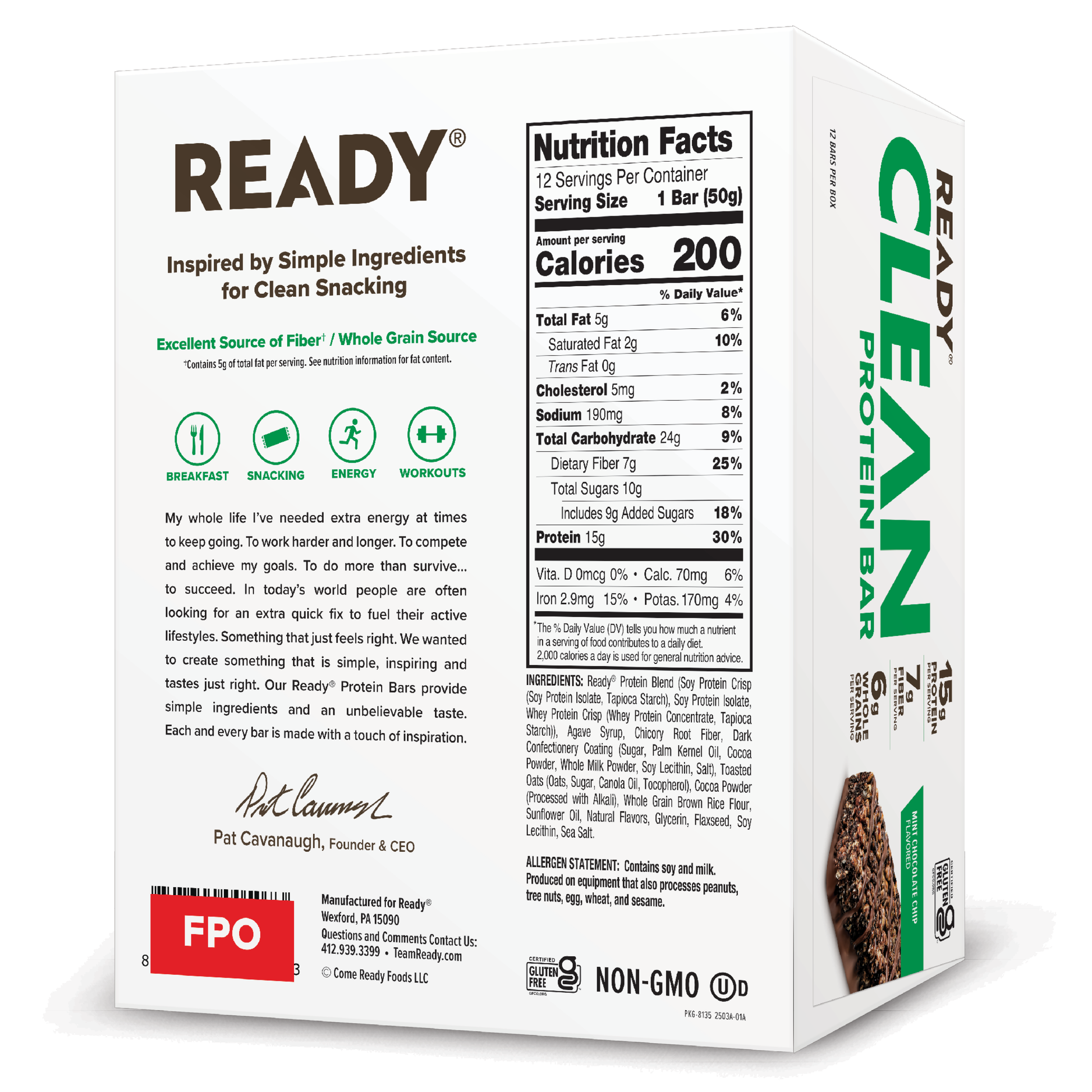 Protein Blend (Soy Protein Crisp [Soy Protein Isolate, Tapioca Starch, Salt], Soy Protein Isolate, Whey Protein Crisp [Whey Protein Concentrate, Tapioca Starch]), Agave Syrup, Chicory Root Fiber, Dark Confectionery Coating (Sugar, Palm Kern Oil, Cocoa Powder, Whole Milk Powder, Soy Lecithin, Salt), Toasted Oats (Oats, Sugar, Canola Oil, Tocopherol), Cocoa Powder (Processed with Alkali), Whole Grain Brown Rice Flour, Sunflower Oil, Natural Flavors, Glycerin, Flaxseed, Soy Lecithin, Sea Salt.